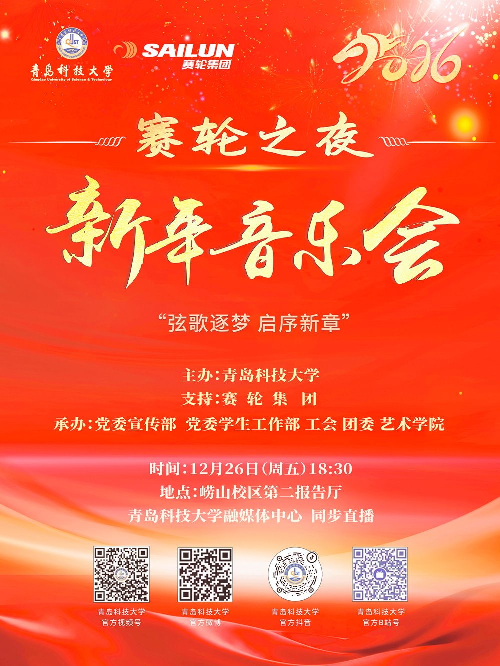2026年新年将至,学校特举办“赛轮之夜”青岛科技大学2026 新年音乐会。本次音乐会由赛轮集团鼎力支持,众多师生与特邀嘉宾倾情表演。诚邀广大师生共赴艺术盛宴,喜迎新年到来!