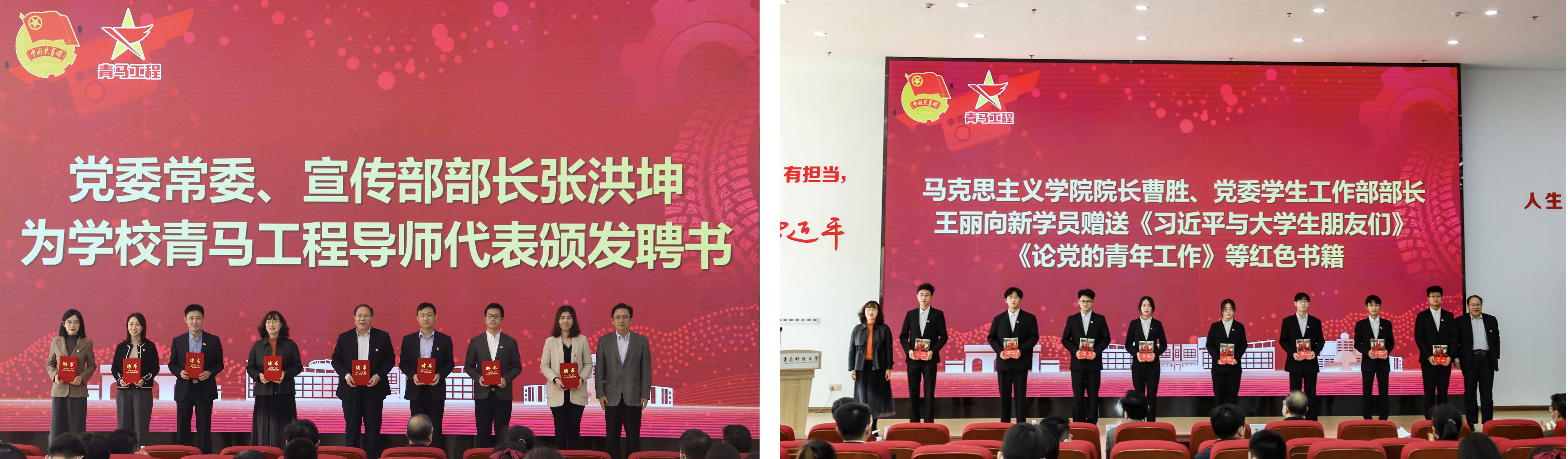 开班仪式上,张洪坤为青马工程讲师代表颁发聘书;马克思主义学院院长曹胜、党委学生工作部部长王丽向新学员赠送《习近平与大学生朋友们》《论党的青年工作》等红色书籍;校团委书记刘跃宁宣读《2022-2023学年“青年马克思主义者培养工程”实施方案》,并对本学年创新构建的“授课+实践”一体化课程建设模式进行了详细解读;学校第二十四届学生会执行主席、信息学院优秀毕业生丁一晟,学校第二十三届研究生支教团成员、高分子学院研究生李志成分别作为往届和新一届青马学员代表发言。