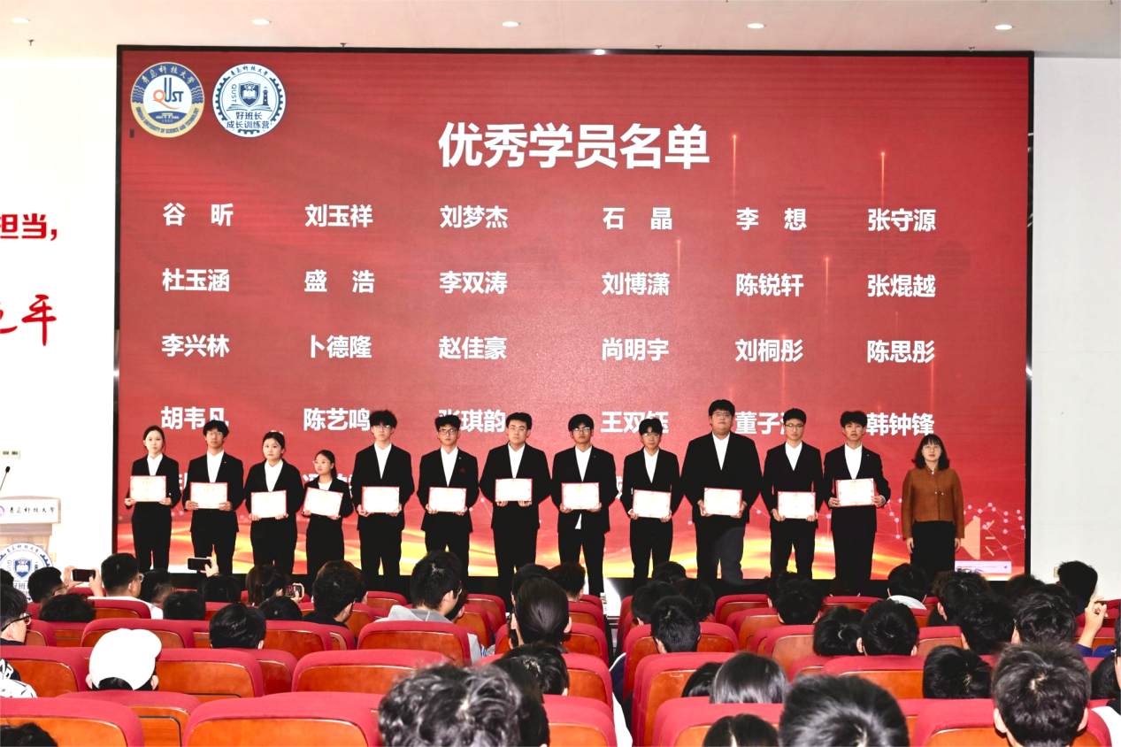 11月25日,学校首届“青科好班长”成长训练营结班仪式在崂山校区北苑报告厅举行。学校党委常委、统战部部长秦姣出席活动。