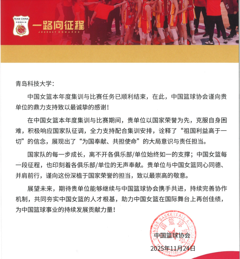 近日,中国篮球协会向学校发来感谢信,对学校在2025年度中国女篮集训与比赛期间的大力支持致以诚挚谢意,高度肯定学校“以国家利益为重、以体育育人为本”的担当精神。信中指出,本年度中国女篮备战任务繁重、形势复杂,青岛科技大学主动克服自身困难,全力配合国家队安排,以实际行动诠释“祖国利益高于一切”的信念,彰显“为国奉献、共担使命”的责任意识与大局担当,为女篮备战参赛提供坚实保障。
