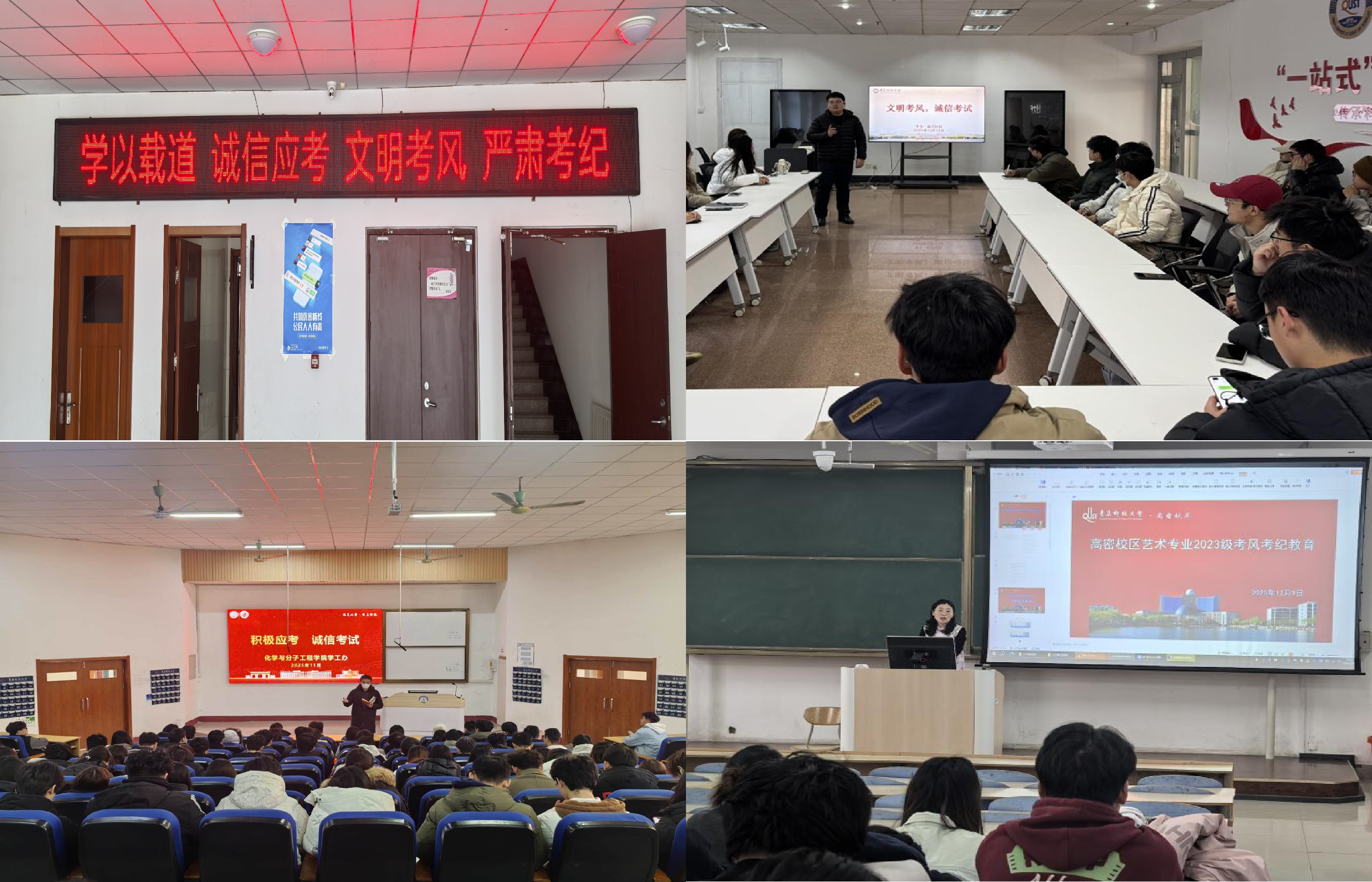 信息学院以期末考试月为契机,举办“文明考风,诚信考试”主题教育,面向全体学生干部重点解读学校考试纪律条款,要求班团干部不断强化自我约束力,端正考风考纪,发挥骨干带头作用。高密校区通过常态化开展考风考纪教育大会、组织签订诚信考试承诺书等一系列举措,持续强化诚信教育,营造了风清气正的考试环境。自动化学院成立由班主任、辅导员组成的多层级巡考督导组,制定详尽巡考计划,进考场践行一线规则,同时设立考风考纪监督举报渠道,对任何形式的舞弊行为坚决做到“零容忍”。化学院采用“一次诚信宣誓、一场案例研讨、一份承诺签署”的“三个一”形式,组织班主任召开诚信考试主题班会,严肃考风考纪,引导学生树立“诚信学习、真实应考”的正确价值观。