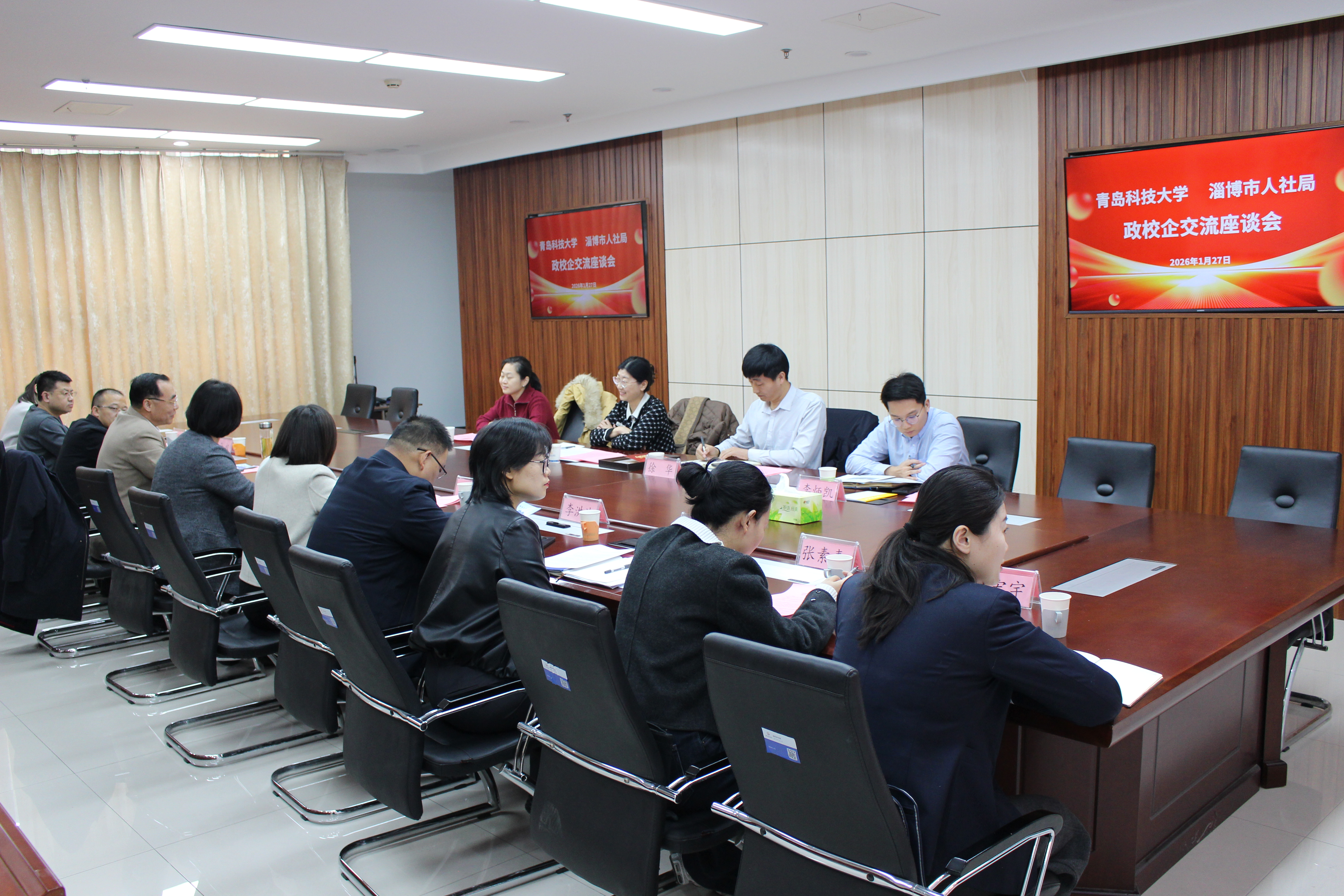 在与两地人社局交流中,王震代表学校分别向滨州市人社局、淄博市人社局致送了感谢状及2026年春季招聘邀请函,表达了对两地人社部门长期以来支持学校就业工作的感谢,标志着双方2026年校园引才合作正式启动。政、校、企三方还围绕人才引进政策落地、校企合作模式创新、实习实训基地共建、技术交流、校友发展支持等话题展开了交流讨论,明确了多项合作方向与实施路径,开启资源共享、优势互补、双向赋能的新阶段。