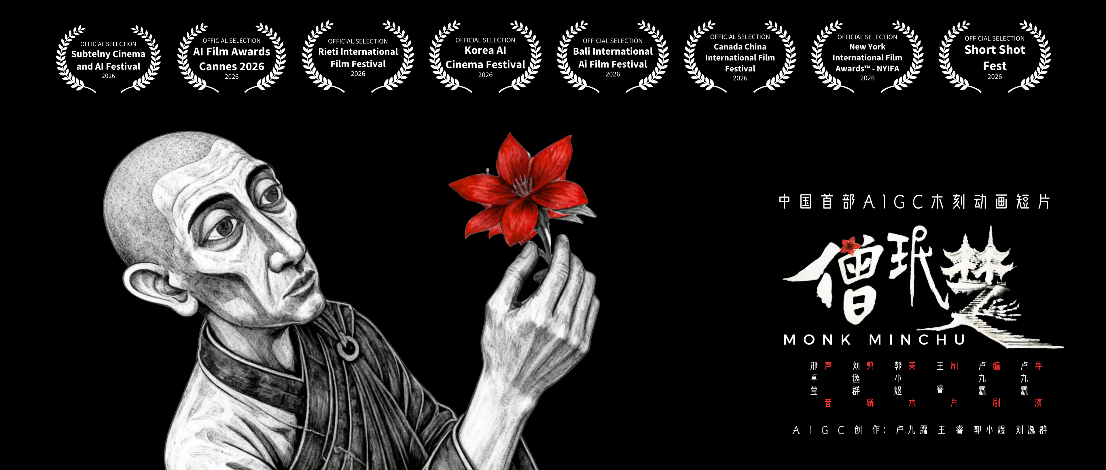 截至目前,《僧珉楚》已接连斩获多项国际电影节认可,成功入围戛纳人工智能电影奖、巴厘岛国际人工智能电影节、中加国际电影节、韩国人工智能电影节、意大利列蒂国际电影节、纽约国际电影奖、波兰Subtelny电影与人工智能电影节、莫斯科国际短片电影节、保加利亚“动画脉动”电影节等多个国际影展。