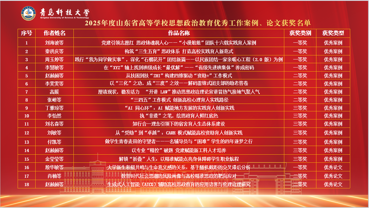 近日,山东省高等学校思想政治教育研究会公布了2025年度山东省高等学校思想政治教育优秀论文和优秀工作案例获奖名单,学校共获得奖项18项,其中优秀案例15项,优秀论文3项。