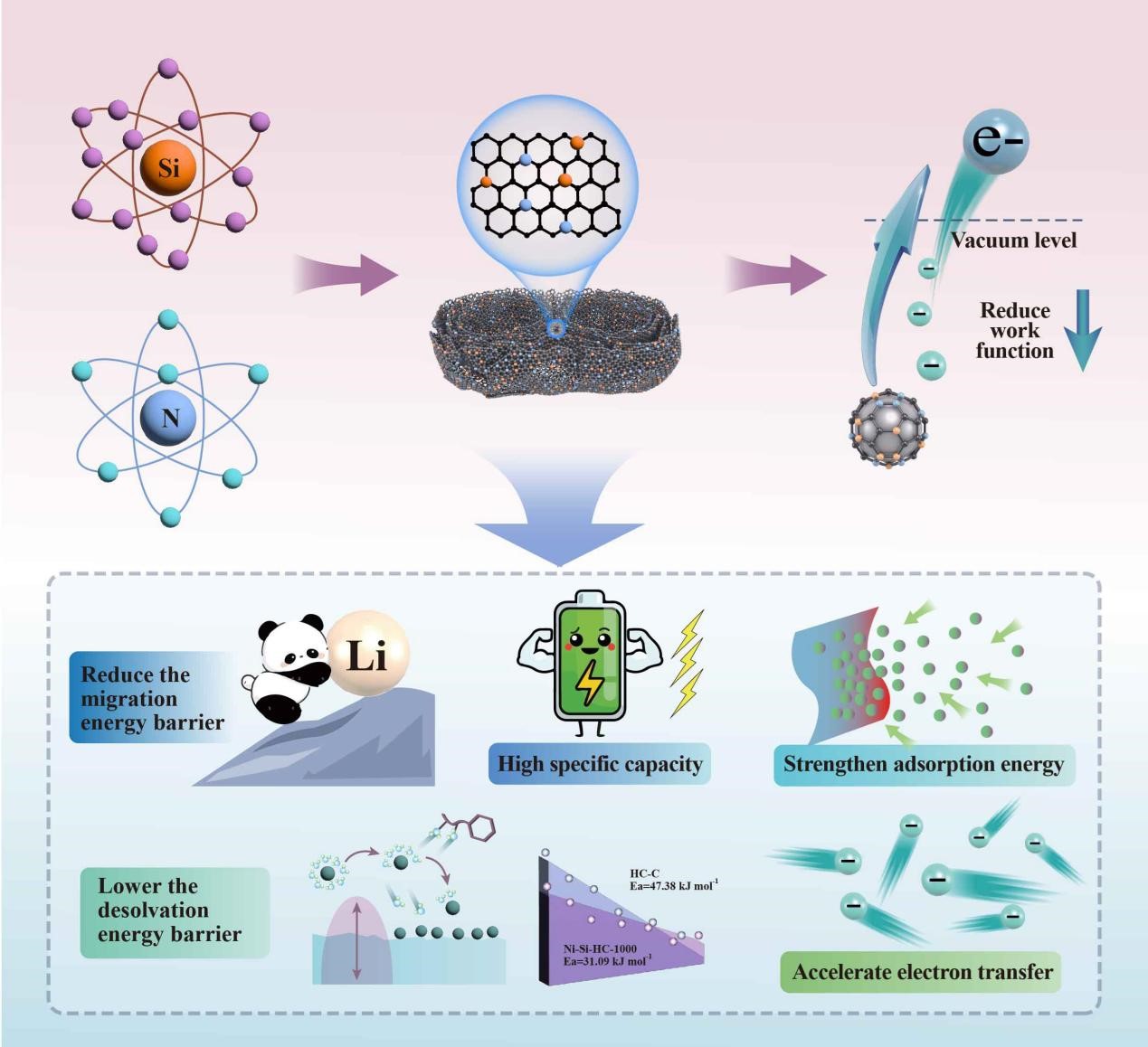 近日,青岛科技大学朱晓东/木天胜团队在《Advanced Functional Materials》期刊上发表了题为“Tailored Work Function by N, Si Co-Doping Enables High-Performance Hard Carbon Anode for Lithium-lon Batteries”的研究论文(中科院一区,影响因子:19)。化工学院研究生宋佳瑶为论文第一作者,朱晓东教授、木天胜副教授为论文共同通讯作者。