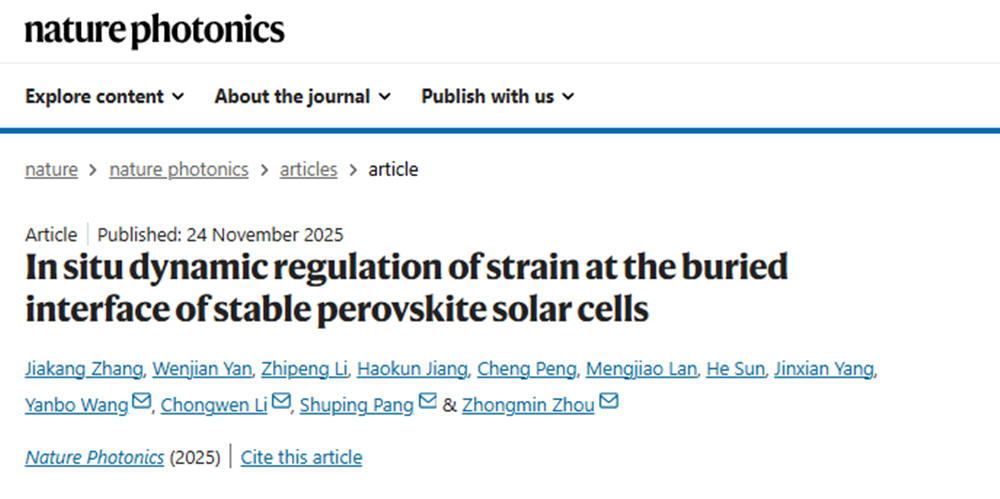 11月24日,青岛科技大学化学与分子工程学院、高性能有机光学聚合物与先进制造全国重点实验室周忠敏教授团队在Nature Photonics期刊发表题为“In situ dynamic regulation of strain at the buried interface of stable perovskite solar cells(稳定钙钛矿太阳能电池埋底界面应变的原位动态调控)”的研究论文。