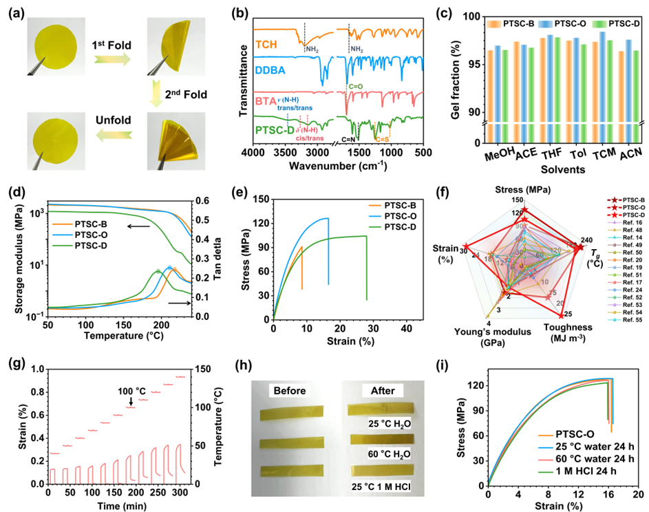 图2 PTSC的结构与性能:(a)无缺陷、透明且具有良好柔性的PTSC薄膜照片,可实现反复折叠与展开;(b)起始单体TCH、DDBA、BTA及所得交联聚合物PTSC-D的FTIR光谱对比;(c)PTSC在多种溶剂(MeOH、ACE、THF、Tol、TCM、ACN)中的凝胶含量;(d)DMA温度扫描所得PTSC的储能模量和tan-δ曲线;(e)PTSC的应力–应变曲线;(f)PTSC的Tg、应力、应变、韧性和杨氏模量与已报道的高Tg(> 50℃)动态共价网络及传统热固性树脂的雷达图对比;(g)PTSC-O拉伸蠕变的时间–温度叠加曲线;(h)PTSC-O薄膜在浸水前、浸水后及于1M HCl中浸泡24 h后的外观照片;(i)PTSC-O薄膜在上述不同处理条件下的应力–应变曲线对比。