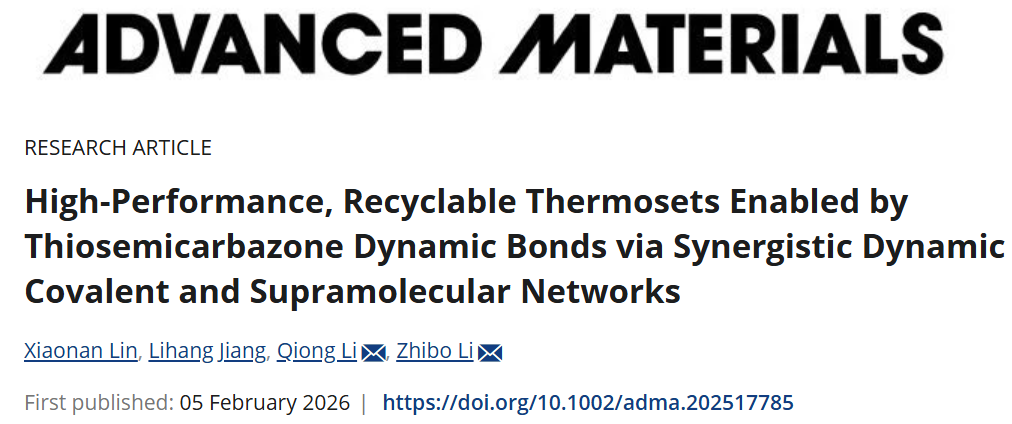 相关研究成果以“High-Performance, Recyclable Thermosets Enabled by Thiosemicarbazone Dynamic Bonds via Synergistic Dynamic Covalent and Supramolecular Networks”为题发表在《Advanced Materials》上。