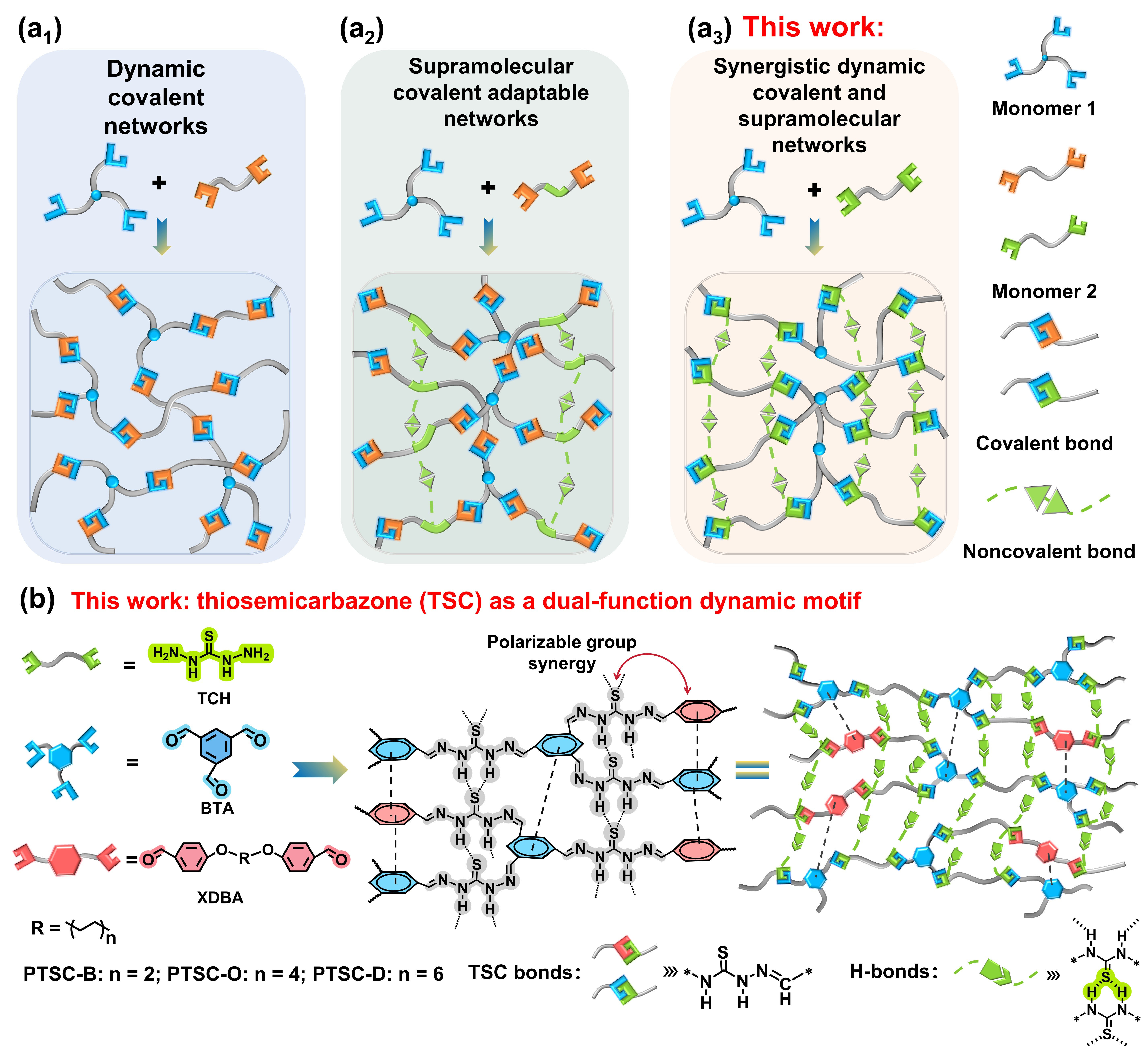 图1网络设计策略示意图。(a1)仅依赖可逆共价键构筑的动态共价网络;(a2)由多种不同动态基元共同构建的超分子/共价可适应网络;(a3)本研究中基于单一动态基元构筑的协同共价-超分子双重网络。(b)通过醛与硫代二酰肼的缩合反应合成聚硫代缩氨基脲(PTSC),利用TSC作为双功能动态基元,实现协同共价与超分子网络的构筑。