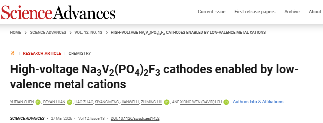 3月27日,青岛科技大学机电工程学院刘治明教授团队在Science Advances期刊发表题为“High-voltage Na3V2(PO4)2F3cathodes enabled by low-valence metal cations(低价金属阳离子构筑的高电压Na3V2(PO4)2F3正极材料)”的研究论文。