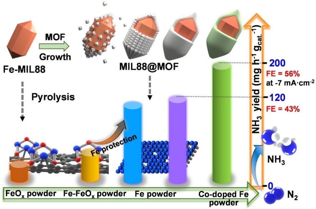针对上述挑战,青岛科技大学陈玉贞教授团队提出一种新型壳保护策略通过MOF制备了体相铁金属电极材料。即精准调控反应温度、搅拌速率等工艺参数,在MIL88表面均匀外延生长异构的MOF保护壳层,煅烧时外层MOF不仅可原位消除MIL88中残余氧物种,形成的氮掺杂碳层可保护内部铁颗粒不被氧化,最终获得高纯多孔铁粉。所得多孔铁粉中丰富的铁空位增强了对氮气的吸附与活化能力;表面微环境实现了竞争性析氢反应的有效抑制;良好的抗氧化和耐酸性能增加了长期稳定性。电化学测试结果显示,该多孔铁粉在-0.24 V vs. RHE(可逆氢电极)电压下,氨产率达120.05 μg h-1 mgcat.-1,法拉第效率为43.44%,较商业铁粉提升超过20倍。打破了体相过渡金属在电催化NRR合成氨的性能限制。在此基础上,通过调控外层MOF中的金属中心,掺杂了少量钴物种构建出的钴掺杂的铁粉末在7 mA cm-2电流密度下,氨产率进一步提升至200.50 μg h-1 mgcat.-1,法拉第效率达56.34%。性能超越了大部分NRR电极材料。这一电流密度值在已报道的非贵金属NRR催化剂中处于较高水平,反映出材料在传质与反应动力学方面的显著优势。与常规体相金属电极材料相比,该多孔铁粉通过铁空位的可控构筑与表面化学环境的协同调控,在氮气活化与析氢抑制之间实现了更优平衡。该策略为开发其他对空气敏感但具有高活性的金属提供了新思路。同时,该研究为开发更多体相过渡金属以实现工业级绿色氨合成提供了指导。