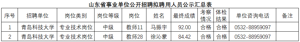 根据事业单位相关规定,按照岗位招聘计划,青岛科技大学组织完成了公开招聘考试、考察、体检等工作,现对拟聘用人员(名单附后)进行公示。