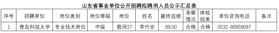 根据事业单位相关规定,按照岗位招聘计划,青岛科技大学组织完成了公开招聘考试、考察、体检等工作,现对拟聘用人员(名单附后)进行公示。