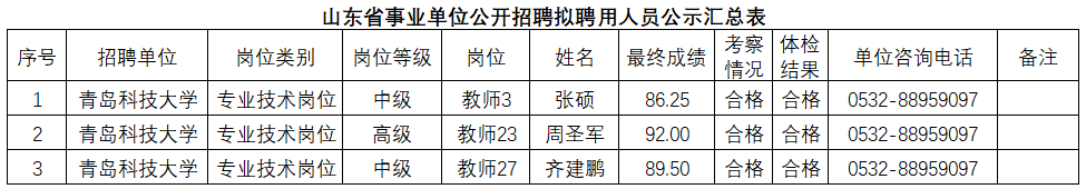 根据事业单位相关规定,按照岗位招聘计划,青岛科技大学组织完成了公开招聘考试、考察、体检等工作,现对拟聘用人员(名单附后)进行公示。