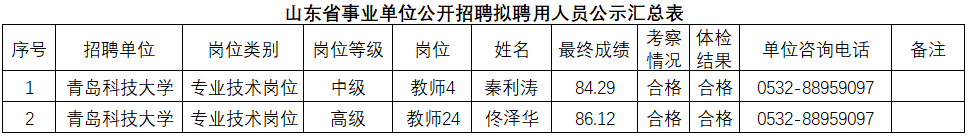 根据事业单位相关规定,按照岗位招聘计划,青岛科技大学组织完成了公开招聘考试、考察、体检等工作,现对拟聘用人员(名单附后)进行公示。