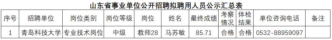 根据事业单位相关规定,按照岗位招聘计划,青岛科技大学组织完成了公开招聘考试、考察、体检等工作,现对拟聘用人员(名单附后)进行公示。