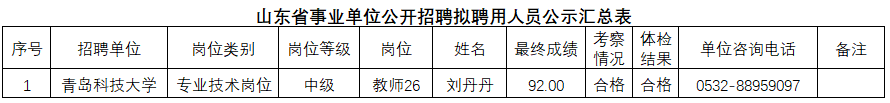 根据事业单位相关规定,按照岗位招聘计划,青岛科技大学组织完成了公开招聘考试、考察、体检等工作,现对拟聘用人员(名单附后)进行公示。