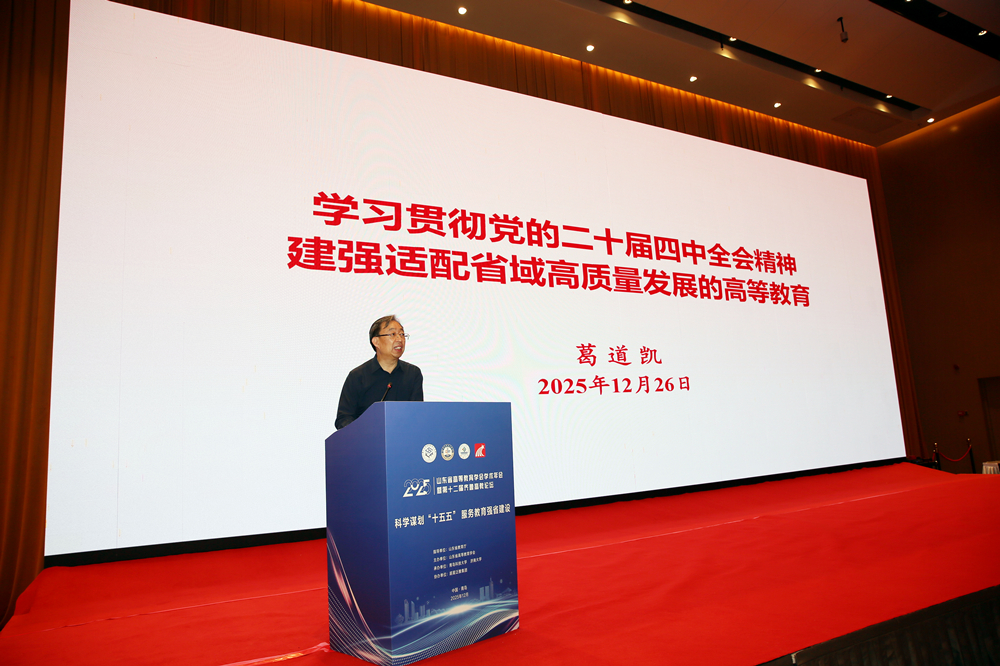 为深入学习贯彻党的二十届四中全会精神,落实教育强国强省建设规划纲要和三年行动计划,助力各高校科学谋划“十五五”时期改革发展目标任务和思路举措,全面推动高等教育高质量发展,12月25日至27日,由山东省教育厅指导、山东省高等教育学会主办、青岛科技大学和济南大学承办的山东省高等教育学会2025年学术年会暨第十二届齐鲁高教论坛在青岛举行。中国高等教育学会副会长葛道凯,对外经济贸易大学党委书记黄宝印,山东省委教育工委委员、省教育厅党组成员、副厅长王浩,山东省高等教育学会会长罗公利,青岛科技大学党委书记杨天梅、校长陈克正等出席会议。