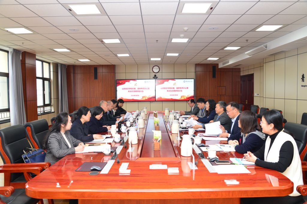 李萍代表学校对李继峰一行来访表示欢迎,介绍了学校历史沿革、发展历程以及学校在学科专业发展、产学研深度融合、人才培养等方面的办学特色,并介绍了学校纪委、监察专员办公室的组织机构及人员情况。李萍表示,山东航空学院纪检监察工作具有很多特色和亮点,一些典型经验值得认真学习,希望两校以此次交流为契机,互学互鉴、取长补短,共同推动纪检监察工作高质量发展。