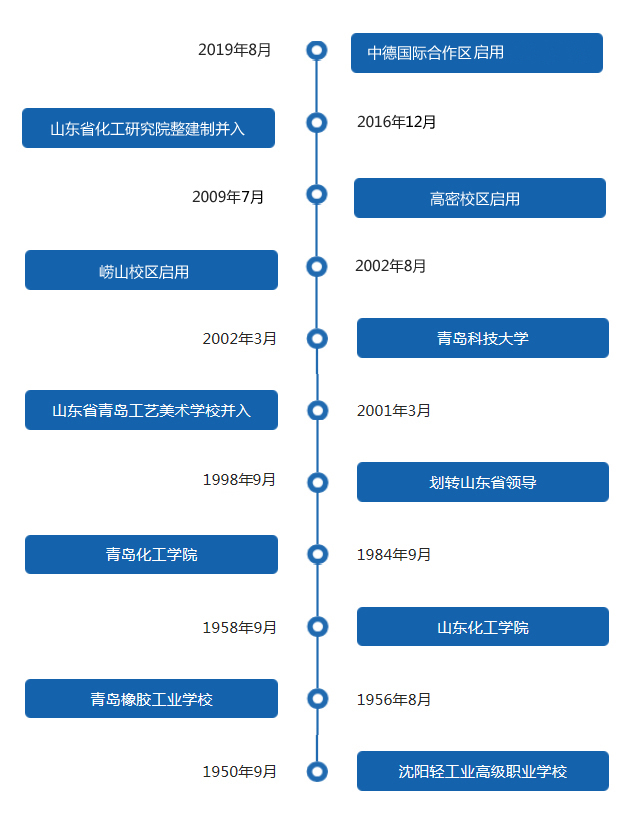 青岛科技大学原名青岛化工学院,为原国家化学工业部直属高校,其前身是1950年9月创建的沈阳轻工业高级职业学校,1956年8月迁至青岛,改名为青岛橡胶工业学校,1958年9月经山东省人民政府批准正式组建为山东化工学院,1984年9月经教育部批准更名为青岛化工学院,1998年划转山东省领导,2001年3月山东省青岛工艺美术学校并入,2002年3月经教育部批准更名为青岛科技大学。2002年8月崂山校区投入使用,2009年7月高密校区投入使用,2016年12月山东省化工研究院整建制并入,2019年8月中德国际合作区投入使用,学校事业发展不断谱写新篇章。